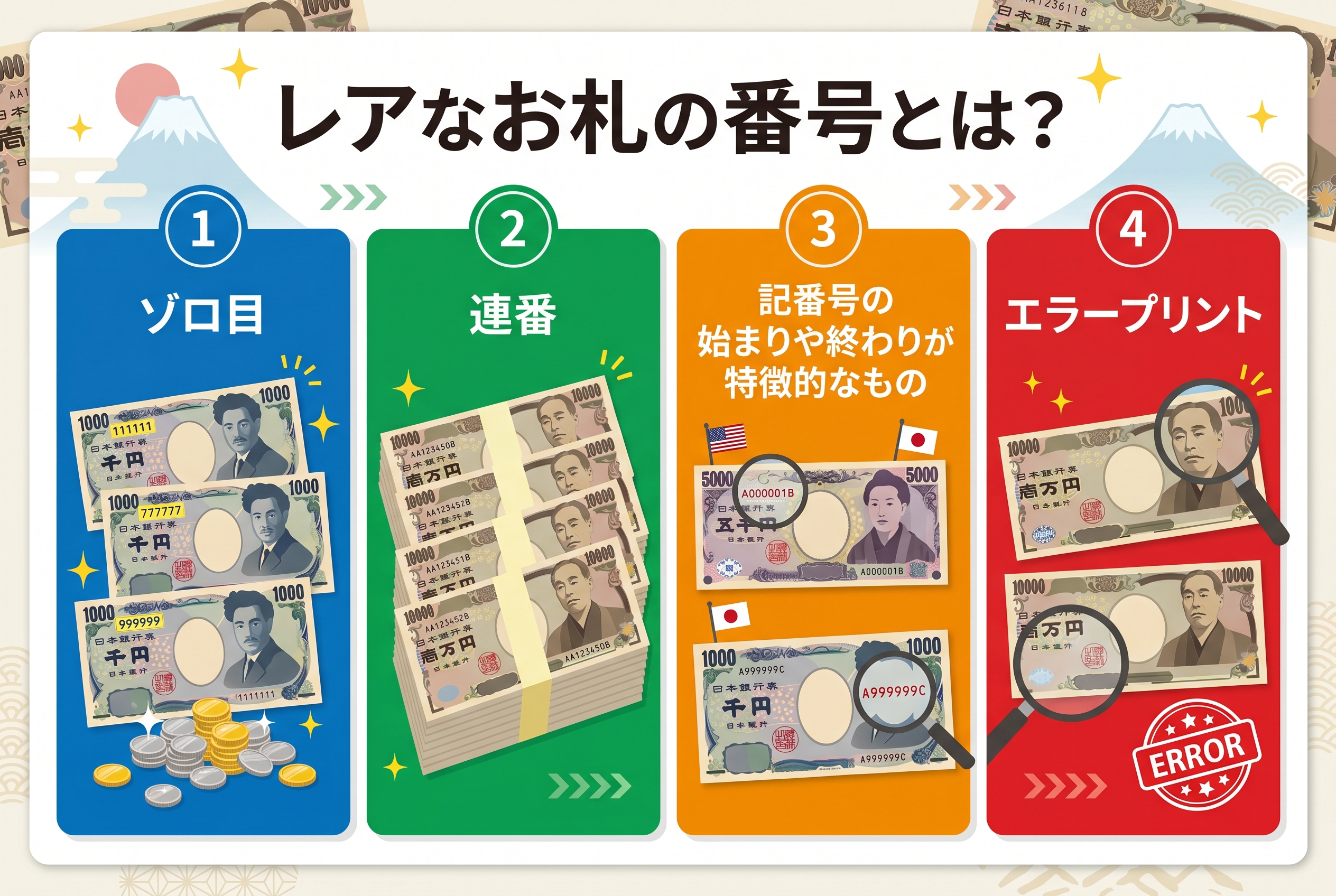 前章では、レアなお札の基本的な種類についてご紹介しました。しかし、単に「ゾロ目だからレア」「連番だから高価」というわけではありません。実は、その番号の組み合わせや状態によって、価値は大きく変動します。この章では、どのような条件が加わるとお札の価値がさらに高まるのか、具体的な判断基準と買取相場の目安を詳しく解説していきます。